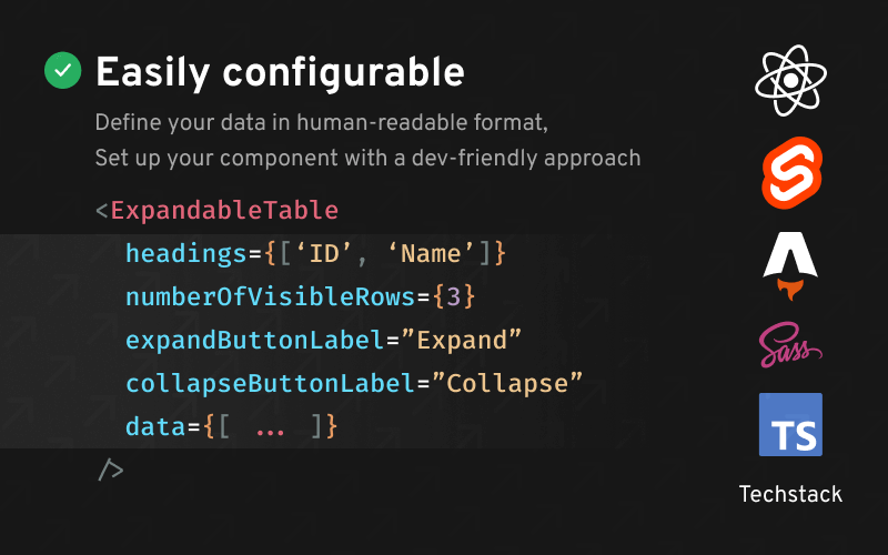 <ExpandableTable />component written in React, Svelte, and Astro meaning you’ll get three different implementation with this product, so you can use it with different tech stacks. - Configurable: Customize the appearance of your tables through props. Set your headings, data, and button labels, as well as the initial number of visible rows.