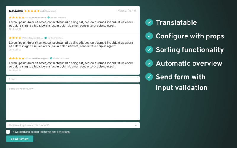 // Calling the component<Reviews defaultSortOrder="newest" emailPlaceholder="Email" reviewPlaceholder="Send us your review" reviewScorePlaceholder="How would you rate this product?" terms="I have read and accept the <a href='/terms'>terms.</a>" ctaLabel="Send Review" reviews={[{ score: 5, category: 'documentation', review: 'Review content', date: '2024 April 12' }, { ... }]}/>- Easy to style: Styles can be configured via Sass variables through the stylesheet provided with the component.