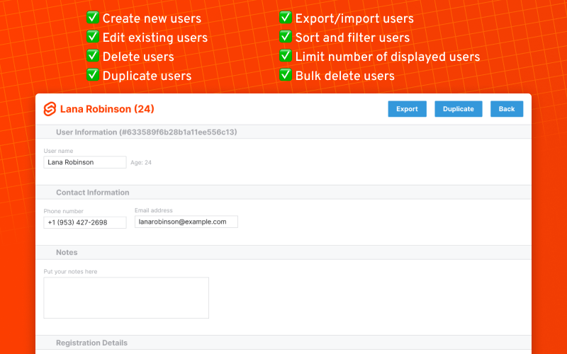 <Pagination>component. Set the number of visible items on a page to customize your table. User-settings are saved into Local Storage. - Duplicate functionality: Duplicate users with a click of a button to create new entries with the same data.
